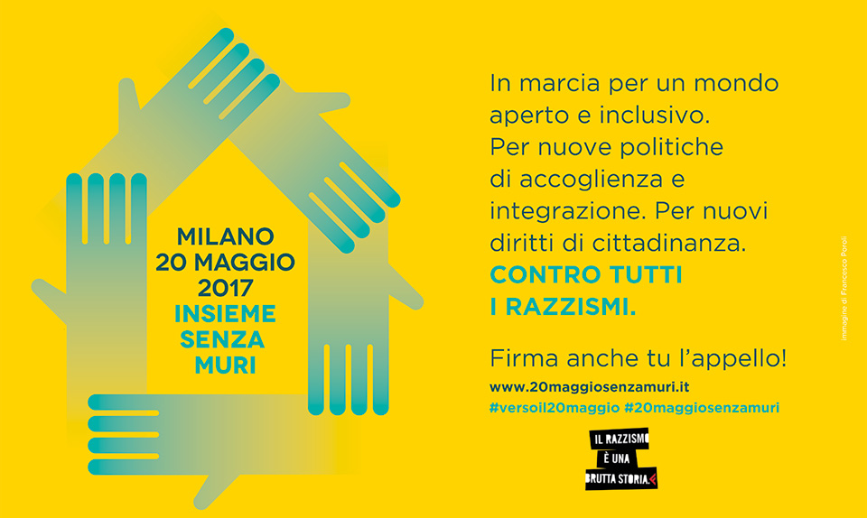 INSIEME SENZA MURI è la grande manifestazione per l’accoglienza che attraverserà Milano il 20 maggio 2017. Un momento per dire che siamo in marcia per un mondo aperto e inclusivo, per nuove politiche di accoglienza e per nuovi diritti di cittadinanza.